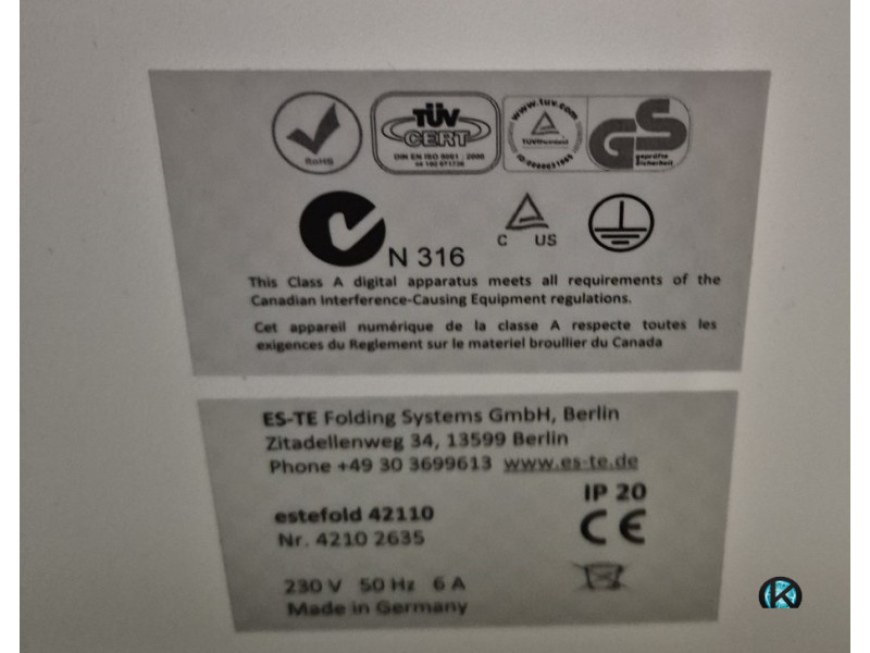 Описание Сгъваемата машина estefold 4211 е напълно автоматична онлайн сгъваема машина (2 сгъвания), компактна, здрава, надеждна и характеризираща се със своята ергономичност и безшумност. Ръчно и автоматично подаване на хартия Скорост на сгъване до 4 м/мин Програми за сгъване: 8 основни и кръстосани Ширина на хартията: 297-930 мм Неограничена дължина на хартията при 1 сгъване, до 2,5 м при кръстосани сгъвания Тегло от 80 до 100 г/м² Регулируем трансферен мост Ултра лесен онлайн контрол Надеждна работа